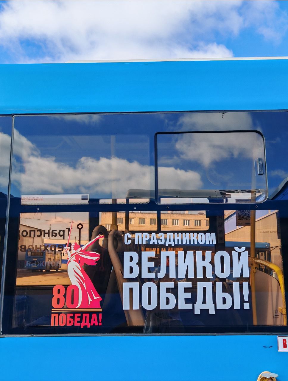 На бортах и стеклах транспортных средств размещены георгиевские ленты, надписи «С праздником Великой Победы!», юбилейный красно-белый логотип 80-летия Победы в Великой Отечественной войне «Родина-мать зовет!», а также символика, посвященная Ржевскому мемориалу Советскому cолдату.